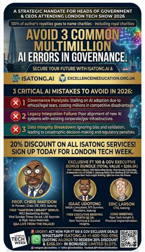 “Boards and governments can no longer treat AI governance as an afterthought,” said Professor Imafidon. “My book and decades of advisory work provide a clear roadmap to avoid ethical breaches, regulatory penalties, integration failures and data-integrity catastrophes that can destroy shareholder value and public trust. This bundle delivers that expertise immediately to the leaders who must act decisively in 2026.” Isatong.ai, under President Isaac Udotong, delivers battle-tested enterprise solutions — from AI-driven productivity tools (including Fireflies.ai integrations that contributed to unicorn growth) to secure blockchain transactions and mission-critical digital transformation — trusted by NASA, the World Bank and Fortune 500 institutions.ExcellenceInEducation.org.uk, chaired by Professor Imafidon, pioneers AI-enhanced education programs that unlock human potential, particularly for underrepresented communities, while advancing responsible technology deployment.Availability is strictly limited to senior executives and officials who engage during London Tech Show 2026 and reference AILONTECH26 when contacting Isatong.ai.