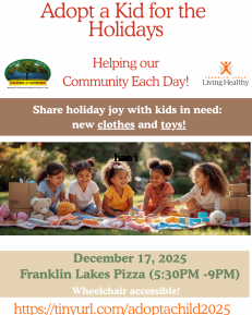 The event will be held at Franklin Lakes Pizza on Wednesday, December 17, 2025, from 5:30 p.m. to 8:15 p.m. Community members are invited to “adopt” a child and commit to donating a new toy and/or a new piece of clothing by registering in advance at the link below. Through this link, participants can sign up for the party, select a child’s name, and provide the requested items to help make that child’s holiday season brighter.